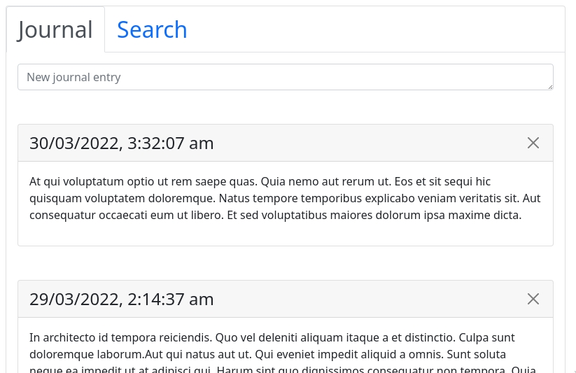 We'll write a simple journal app, called "Journal". In the browser, users will be able to add plaintext journal entires organized by date. They'll be able to scroll through their entires in ascending date order, with more entries loaded each time the bottom of the list is reached. They'll be able to edit and delete old entries, and search through entries by specifying a date range.