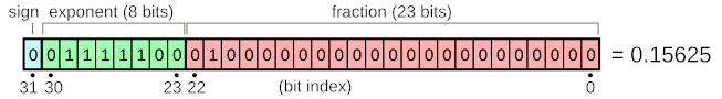 This number, 0b11.1110.0010.0000.0000.0000.0000.0000, is converted to decimal as (−1)0×2(124−127)×1.25=2−3×1.25=0.15625.