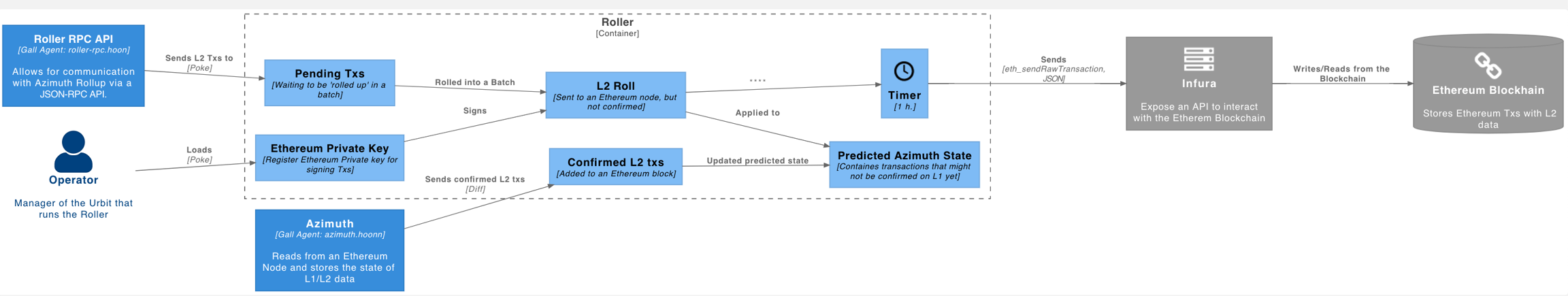 %roller%roller is the Gall agent which collects layer 2 Azimuth transactions, which are a concatenation of an action and a signature and forms them into batches to be submitted periodically to the Ethereum blockchain.