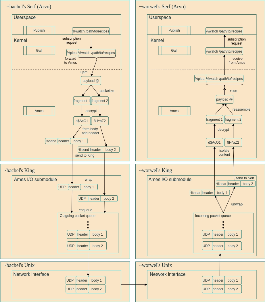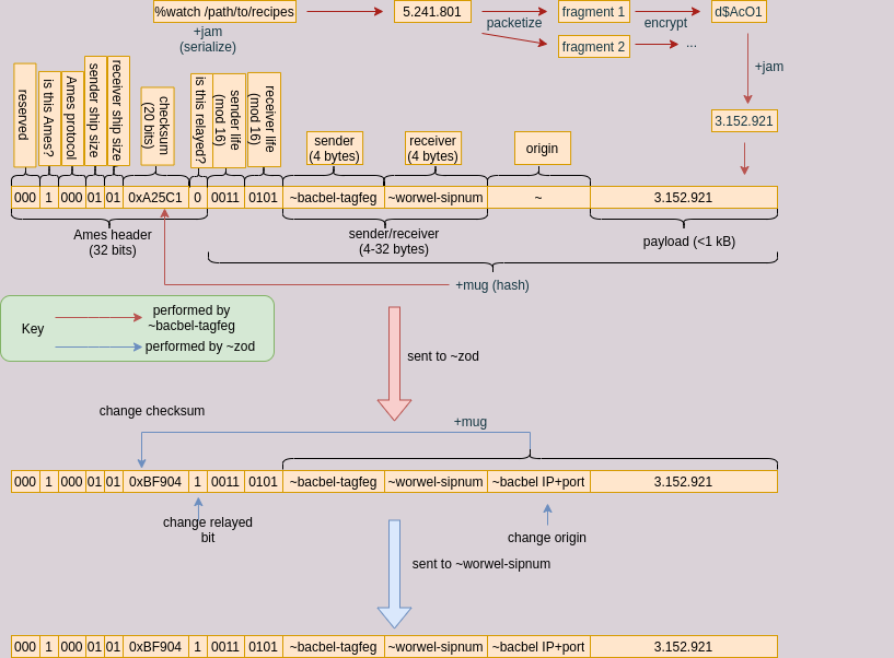 Ames datagram packets are handled as nouns internally by Arvo but as serial data by Unix. In this section we describe how packets are formed, serialized, and relayed.