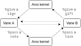 Note that %passing a $note doesn't always result in a return - this diagram just shows the complete cycle. However, %giveing a gift is always in response to being %passed some task. Since the Arvo kernel acts as a middleman between all $moves in Arvo, in diagrams we will generally represent the intermediate steps of a vane %passing a $note to the kernel addressed to another vane followed by the kernel %passing a task to the addressed vane as a single arrow from one vane to the other to make the diagrams less cluttered.